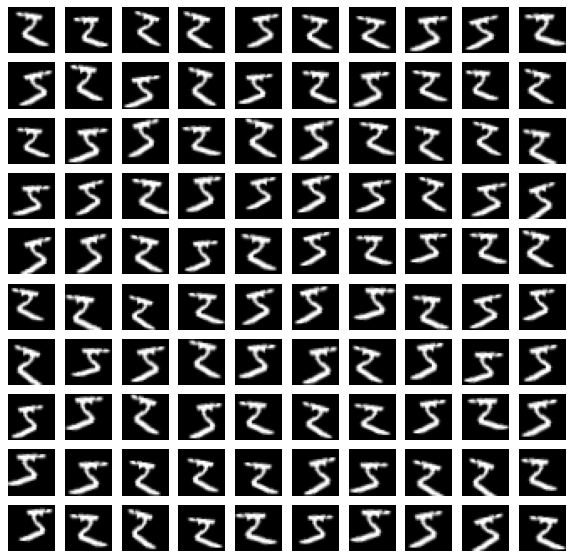 x_augument = img_gen.flow(np.tile(x_train[0].reshape(28*28), 100).reshape(-1, 28, 28, 1),