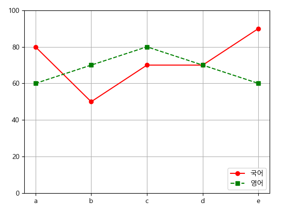 plt.legend(['국어', '영어'], loc = 4)