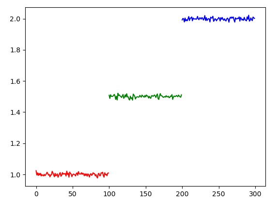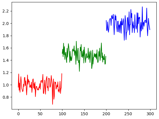 plt.plot(np.arange(100) + i * 100, data[i], color=col[i]) # 그래프