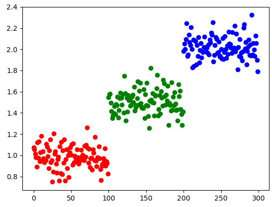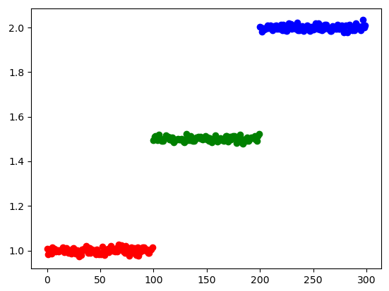 plt.scatter(np.arange(100) + i * 100, data[i], color=col[i]) # 산포도