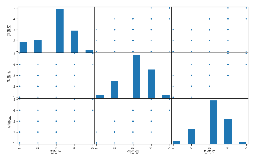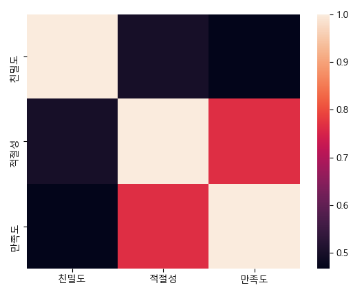 - 어떤 상품에 대한 친밀도, 적절성, 만족도에 대한 상관관계 확인.