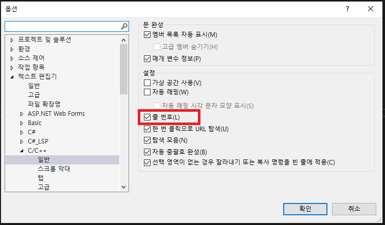 Visual studio 줄 번호 보이기